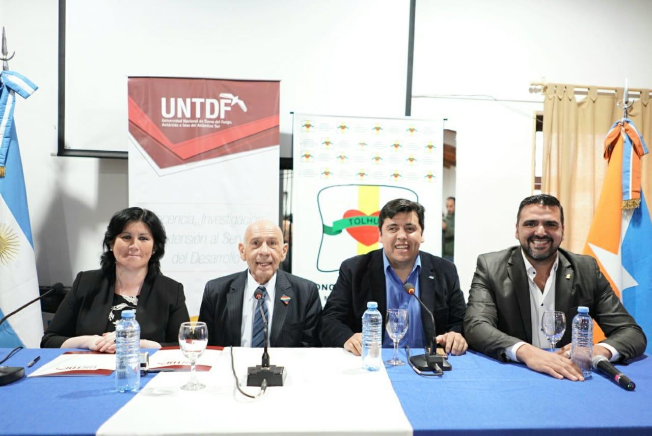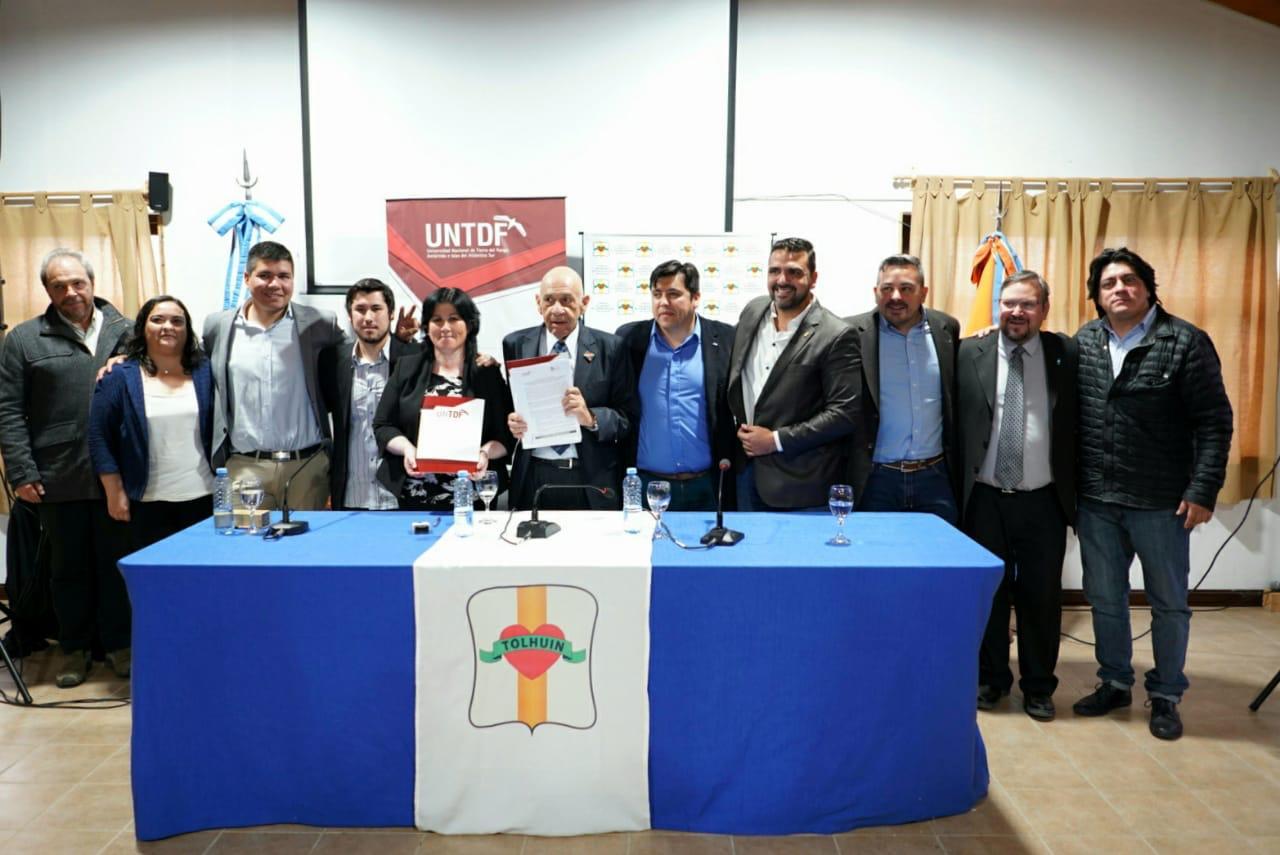 TOLHUIN.- Con la presencia del Intendente de Ushuaia, Walter Vuoto y del Intendente de la ciudad de Tolhuin, Daniel Harrington, se realizó la firma del Convenio de colaboración y cooperación institucional recíproca entre el Rector de la Universidad Nacional de Tierra del Fuego (UNTDF) Juan José Castelucci y la Presidenta del Concejo Deliberante de Tolhuin, Jeannette Alderete en la sede de dicho organismo. En otro de los convenios firmados quedó establecida la Nueva sede de la UNTDF en la ciudad de Tolhuin.