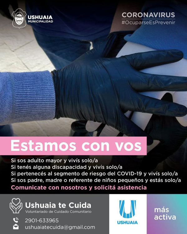 USHUAIA.- En el marco de la crisis sanitaria por la pandemia del COVID-19 y las medidas de prevención adoptadas en Ushuaia, la Municipalidad puso en marcha “Ushuaia te Cuida”, una red comunitaria de asistencia directa para garantizar el cumplimiento de la cuarentena a aquellas personas que tengan especial indicación institucional o formen parte del segmento de riesgo, como adultos mayores o personas con discapacidad que vivan solas o en situaciones de vulnerabilidad. A través de la Secretaría de Políticas Sociales, Sanitarias y Derechos Humanos se lleva adelante el relevamiento para construir la red de asistencia “Ushuaia te cuida”, que incluye compra o retiro de insumos de primera necesidad como alimentos, elementos de salud e higiene; identificación de demandas sociales tanto médicas como psicológicas o alimentos directos.