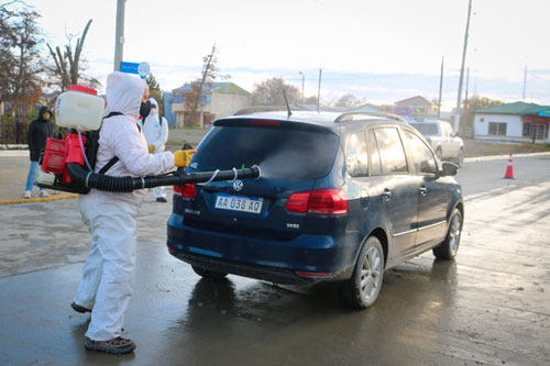 TOLHUIN.- Este domingo se llevó a cabo la desinfección de vehículos particulares correspondiente a patentes terminadas del 5 al 9. En la jornada se registraron un total de 120 vehículos desinfectados por la Dirección de Defensa Civil del Municipio en conjunto con la Unidad Provincial de Manejo del Fuego que se abocó a la desinfección de las veredas en los establecimientos públicos donde circulan los vecinos. “Si bien estos trabajaos ya se venían haciendo de manera paulatina con otro tipo de equipamiento, en esta oportunidad con equipos de ataque rápido de la Unidad de Manejo de Fuego podemos hacerlo de manera más eficaz y más rápida”, expresó Ricardo Bucarey Director de Defensa Civil Tolhuin.