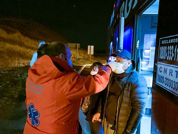 El secretario de Gestión de Sistemas Sanitarios del Ministerio de Salud, Dr. Javier Barrios, relató al respecto que “para el chequeo de la gente que ingresó éramos cuatro enfermeros y un médico. También participó del operativo personal de Gendarmería, de Policía, la gente de desinfección y Protección Civil”. “Hicimos un trabajo conjunto para esperar el micro que venía acompañado por un móvil del Gobierno de Chile. Tomamos la temperatura a los choferes y a los 36 pasajeros quienes firmaron la declaración jurada. También se sanitizó el colectivo”, indicó.