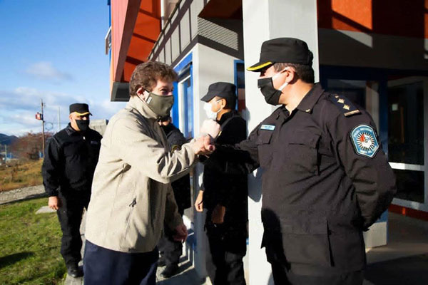 USHUAIA.- El Gobernador de la Provincia Prof: Gustavo Melella, junto a la Vicegobernadora Mónica Urquiza, el Jefe de la policía Jacinto Rolón y la Ministra de Gobierno, Justicia y Derechos Humanos, Adriana Chapperón, recorrimos las distintas dependencias en Ushuaia saludando al personal policial que está cumpliendo funciones. Al mismo tiempo entregarle en forma personal el saludo por su dia y darles el agradecimiento infinito por tanto esfuerzo y mas ahora en momentos tan dificiles que esta pasando el mundo y por ende nuestra provincia, sin medir ni objetar han puesto el cuerpo para llevar tranquilidad y orden en nuestro lugar para luchar y combatir la expacion del «Coronavirus», sin ellos que son parte de esta lucha no hubiese sido posible y mas aun redoblar esfuerzo, porque aun esto no ha terminado. Llevarles en nombre de nuestros ciudadano el gracias totales por todo.