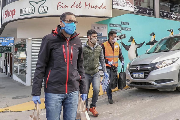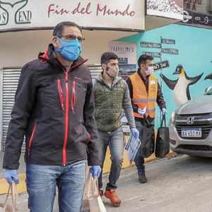 USHUAIA.- La Municipalidad de Ushuaia continúa con la entrega de kits sanitizantes a comercios de la ciudad que reabrieron sus puertas. En calle San Martín, el Secretario de Economía y Finanzas Gustavo Rodríguez, la secretaria de Hábitat Lorena Henriques Sanches y la subsecretaria de Cultura Belén Molina entregaron en cada comercio el módulo con elementos básicos para la prevención y desinfección. Por su parte, el concejal Gabriel de la Vega y el jefe de Gabinete municipal David Ferreyra, estuvieron recorriendo y entregando los kits a los comercios de la zona comercial Kuanip.