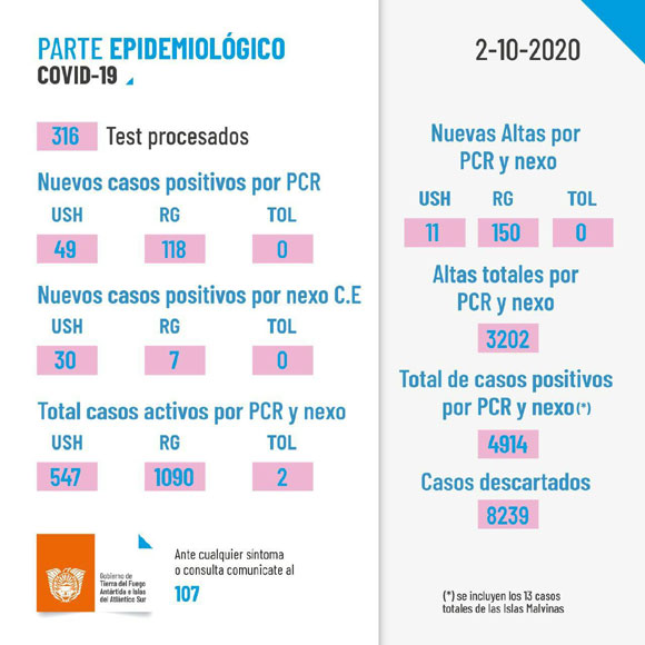 USHUAIA.- La Dirección de Epidemiología e Información de la Salud del Ministerio de Salud del Gobierno de la Provincia de Tierra del Fuego, Antártida e Islas del Atlántico Sur informa el reporte diario provincial en relación a la pandemia por coronavirus Covid-19: