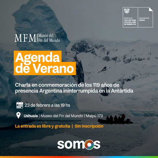 USHUAIA.-    La Secretaría de Cultura de la provincia, a través de la Dirección de Museos y Patrimonio Cultural, invita a la comunidad a participar de la charla por los 119 años de presencia Argentina ininterrumpida en la Antártida, con entrada libre, gratuita y sin inscripción previa. Se realizará mañana 23 de febrero a las 19:00 en el Museo del Fin del Mundo (Maipú 173).