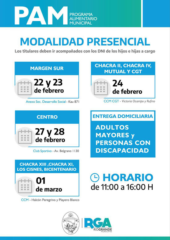 RIO GRANDE.-   Es para quienes estén empadronados en el Programa Alimentario Municipal. La distribución será de manera presencial desde este miércoles 22 de febrero. Para adultos mayores y personas con discapacidad la entrega será domiciliaria.