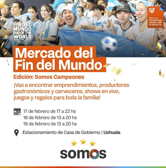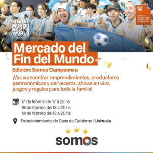 En un trabajo articulado entre el Ministerio de Jefatura de Gabinete, INFUETUR, el Ministerio de Desarrollo Humano, a través de la Secretaría de Economía Popular, el Ministerio de Gobierno, Justicia y Derechos Humanos y el Instituto Fueguino de Turismo, se llevará adelante por primera vez esta edición del Mercado del Fin del Mundo, con la temática «Somos Campeones» para festejar y celebrar junto a las vecinas y vecinos de la ciudad de Ushuaia.