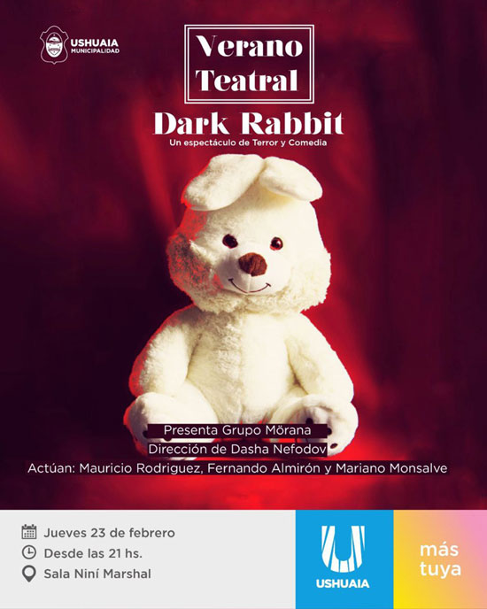 USHUAIA.- La Municipalidad de Ushuaia, a través de la Secretaría de Cultura y Educación, llevará adelante este jueves 23 de febrero a las 21:00 horas en la Sala Niní Marshall una nueva jornada del programa “Verano Teatral” con la presentación de Dark Rabbit: un espectáculo de Terror y Comedia.