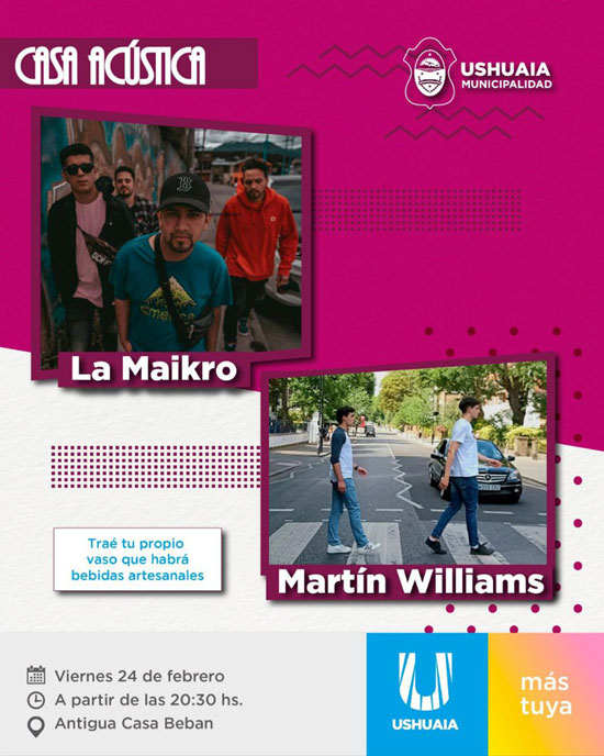 USHUAIA.- Continuando con las diversas actividades propuestas para esta temporada de verano, la Secretaría de Cultura y Educación de la Municipalidad de Ushuaia llevará adelante una nueva jornada de “Casa Acústica” este viernes 24 de febrero desde las 20:30 hs en la Antigua Casa Beban, donde se presentarán las bandas Martín Williams y La Maikro.