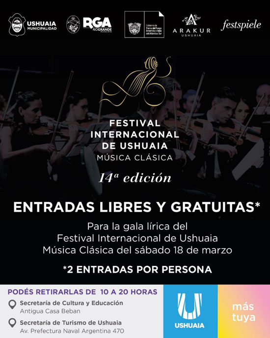 USHUAIA.- A través del auspicio de la Municipalidad de Ushuaia, se entregarán este viernes entradas libres y gratuitas a todos los vecinos y vecinas que deseen asistir a la Gala de Apertura del Festival Internacional de Ushuaia de Música Clásica, la cual se llevará adelante el sábado 18 de marzo desde las 21 horas en el hotel Arakur de nuestra ciudad.