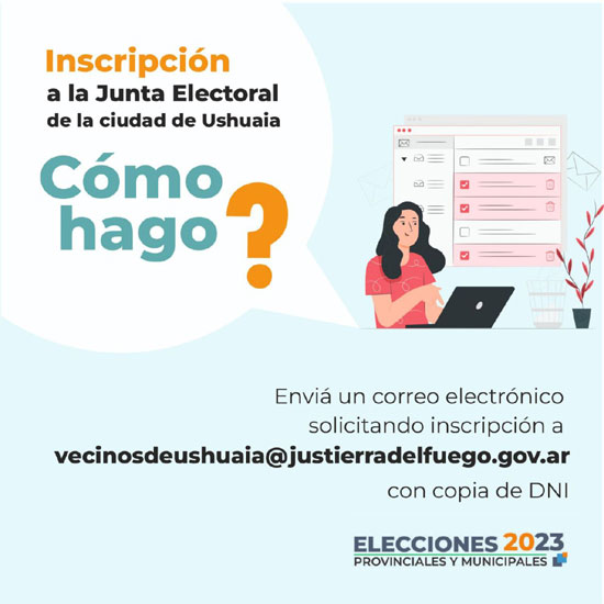 USHUAIA.- El Juzgado de Primera Instancia Electoral de la Provincia de Tierra del Fuego, Antártida e Islas del Atlántico Sur, comunica que se encuentra abierta la inscripción de vecinos y vecinas, para formar parte de la Junta Electoral de la ciudad de Ushuaia.