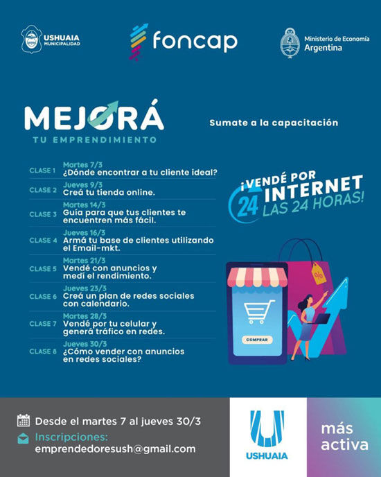 USHUAIA.- El Ministerio de Economía de la Nación, a través del FONCAP y la Municipalidad de Ushuaia lanzan una capacitación para emprendedores y emprendedoras de la ciudad. “Serán 8 clases que permitirán saber todo lo necesario para iniciar e incrementar las ventas on-line”, dijo el subsecretario de Desarrollo Económico municipal, Gustavo Ventura.