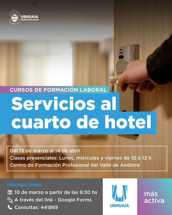 USHUAIA.- La Municipalidad de Ushuaia a través de la Secretaría de Economía y Finanzas invita a los vecinos y vecinas interesados en capacitarse en “servicios al cuarto de hotel”, dentro de los cursos de Formación Laboral, podrán hacerlo desde el viernes 10 de marzo mediante plataforma virtual.