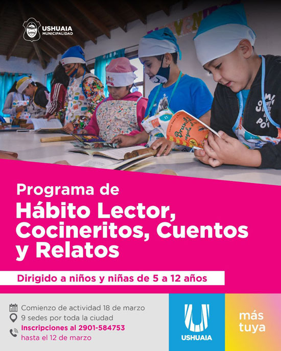 USHUAIA.-    El programa socioeducativo Hábito Lector, con su propuesta pedagógica “Cocineritos, Cuentos y Relatos”, dependiente de la Secretaría de Cultura y Educación de la Municipalidad de Ushuaia, abre las inscripciones hasta el 12 de marzo para que niños y niñas de la ciudad participen en distintos puntos de la ciudad durante este 2023.