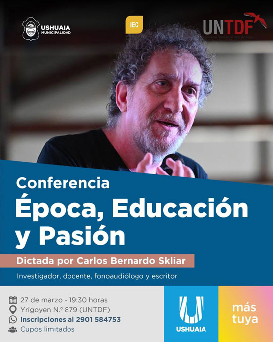USHUAIA.- La Municipalidad de Ushuaia, a través de la Secretaría de Cultura y Educación en conjunto con el Instituto de Educación y Conocimiento de la Universidad Nacional de Tierra del Fuego, llevará adelante el día 27 de marzo en la sede de calle Yrigoyen a las19:30 horas la conferencia “Época, Educación, Pasión” que contará con la exposición del investigador, docente, fonoaudiólogo y escritor Carlos Bernando Skliar.