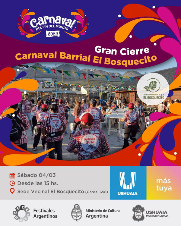 USHUAIA.- La Municipalidad de Ushuaia, a través de la Secretaría de Cultura y Educación, llevará adelante este sábado 4 de marzo a partir de las 15:00 horas en la sede vecinal El Bosquecito el gran cierre del “Carnaval Barrial” con la actuación de distintas expresiones de nuestra ciudad.