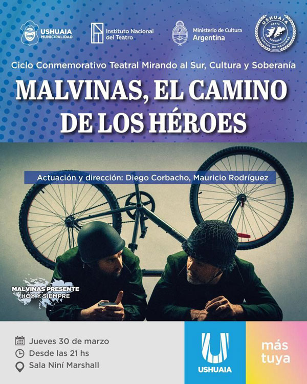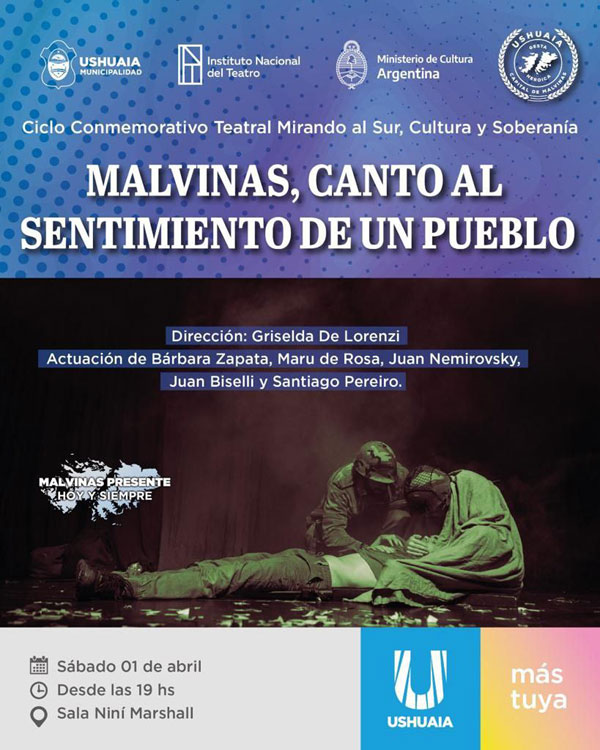USHUAIA.-    La Secretaría de Cultura y Educación de la Municipalidad de Ushuaia, conjuntamente con la Secretaría de Asuntos Malvinas y el acompañamiento del Instituto Nacional de Teatro (INT) y el Ministerio de Cultura de la Nación, llevarán adelante la presentación del Ciclo Conmemorativo Teatral “Mirando al Sur, Cultura y Soberanía” en la sala Niní Marshall en el marco de las actividades del 2 de Abril, Día del Veterano y de los Caídos en la Guerra de las Malvinas.