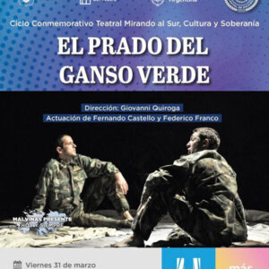 La puesta en escena del viernes 31 de marzo será “El prado del Ganso Verde”, la cual relata las penurias materiales y morales de un sargento y un soldado durante la batalla de Goose Green en el marco del conflicto bélico. El soldado observa paralelismos históricos con la Campaña del Desierto.