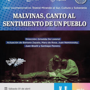 El cierre del ciclo, será el 1 de abril a las 19 hs con la obra estrenaba en 1992 “Malvinas, Canto al sentimiento de un pueblo” la primera producida en Argentina en homenaje héroes. La misma fue escenificada en todo el país, y también en España, Perú, Ecuador, Colombia y Venezuela, recibiendo los máximos elogios de la crítica especializada, en sus más de 1200 funciones. Tras 20 años vuelve a ser interpretada en Ushuaia.