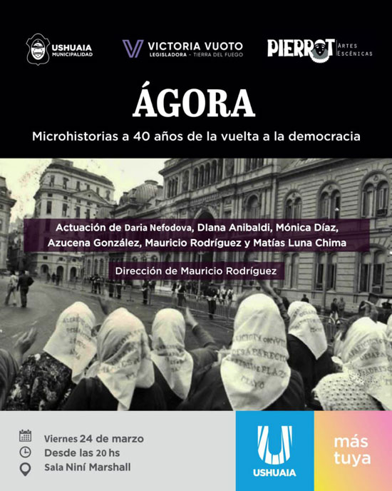 USHUAIA.- La Secretaría de Cultura y Educación de la Municipalidad de Ushuaia, con el acompañamiento de la legisladora Victoria Vuoto, llevará adelante este 24 de marzo a las 20:00 horas en la Sala Niní Marshall de la Casa de la Cultura la presentación de la obra teatral “Ágora: Microhistorias a 40 años de la vuelta a la democracia”.