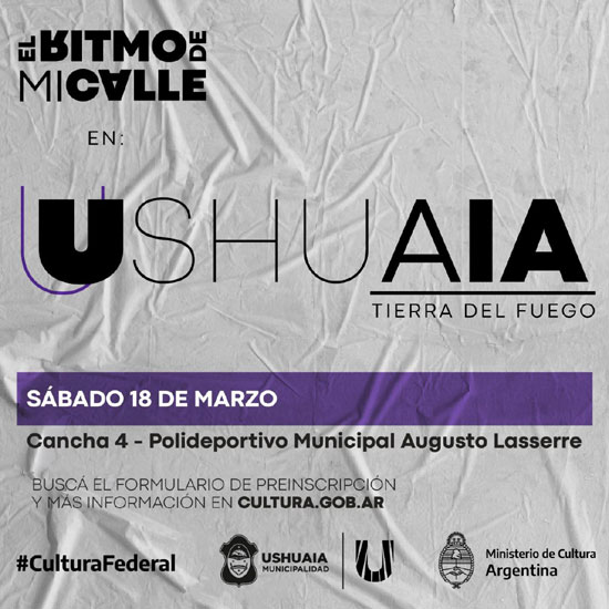 USHUAIA.- La Secretaría de Cultura y Educación de la Municipalidad de Ushuaia, acompañará las actividades enmarcadas bajo la edición 2023 de “El Ritmo De Mi Calle”, programa impulsado por el Ministerio de Cultura de la Nación el día 18 de marzo. Con actividades de capacitación y competencia en Freestyle, Allstyle, Breaking y Hip Hop, las y los interesados podrán inscribirse a través del siguiente formulario: https://forms.cultura.gob.ar/index.php/464143?lang=es .