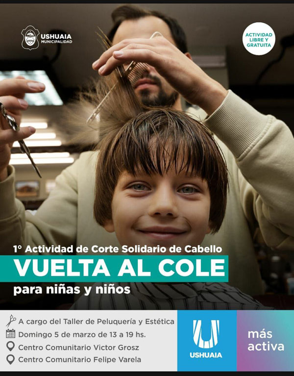 USHUAIA.- La Municipalidad de Ushuaia, a través de la Secretaría de Políticas Sociales, Sanitarias y Derechos Humanos, llevará adelante una jornada “Vuelta al Cole” de corte solidario de cabello.