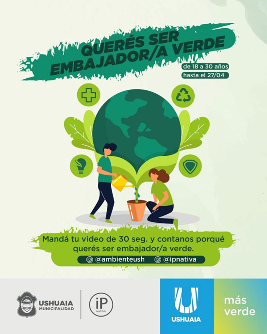 USHUAIA.-   La Municipalidad de Ushuaia, mediante la Secretaría de Medio Ambiente y Desarrollo Sustentable, anuncia el lanzamiento del concurso «Elección Embajadora o Embajador Verde» Edición 2023.