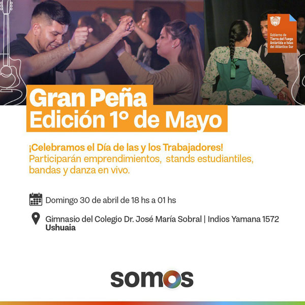 Por su parte, en Ushuaia, la Gran Peña edición 1° de Mayo está a cargo de la subsecretaría de Juventudes. Se realizará el próximo domingo 30 de mayo en el Gimnasio del Colegio Dr. José María Sobral, ubicado en Indios Yamana 1572, de 18:00 a 01:00.