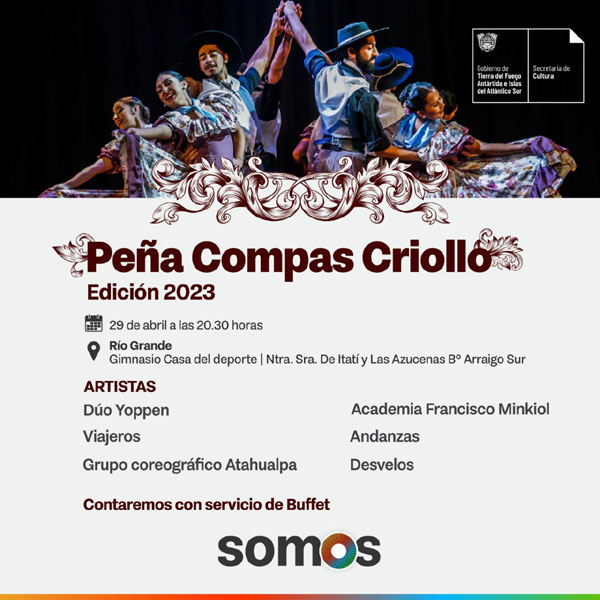 En Río Grande tendrá lugar una nueva edición del ciclo de peñas ‘Compás Criollo’, organizada por la Secretaría de Cultura a través de la Dirección Provincial de Gestión Cultural. En esta oportunidad la cita es el sábado 29 en la Casa del Deporte ubicada en Las Azucenas y Nuestra Señora de Itatí del barrio Arraigo Sur, a partir de las 20:30, con la puesta en escena musical del Dúo Yoppen, Viajeros y Desvelos y la danza a cargo de los grupos Atahualpa, Andanzas y Academia Francisco Minkiol. También, habrá un importante servicio de buffet.