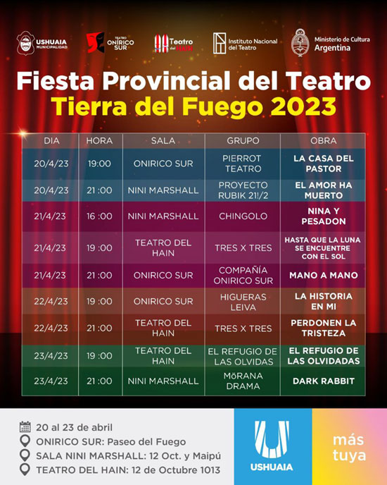 USHUAIA.- La Municipalidad de Ushuaia, a través de la Secretaría de Cultura y Educación, acompañará la Fiesta Provincial del Teatro Tierra del Fuego 2023, llevada adelante por el Instituto Nacional del Teatro (INT), del 20 al 23 de abril.