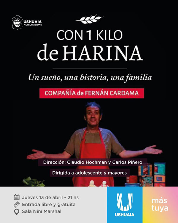 USHUAIA.- La Secretaría de Cultura y Educación de la Municipalidad de Ushuaia presentará la obra teatral “Con un kilo de harina” el próximo jueves 13 de abril a las 21:00 horas en la Sala Niní Marshall con entrada libre y gratuita.