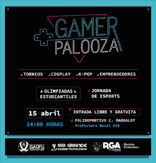 El Municipio de Río Grande, junto a Gamers del Fuego (GADFU), llevarán adelante este sábado 15 de abril una nueva edición de “Gamerpalooza”, donde los participantes podrán competir en diferentes disciplinas de deportes electrónicos.