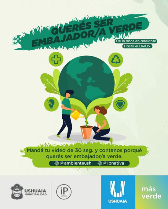 USHUAIA.- La Municipalidad de Ushuaia, mediante la Secretaría de Medio Ambiente y Desarrollo Sustentable, anuncia el lanzamiento del concurso «Elección Embajadora o Embajador Verde» Edición 2023.