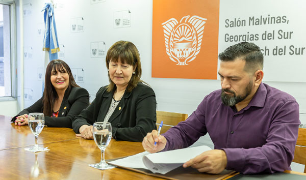 USHUAIA.- En el salón Malvinas de la casa de Gobierno, se llevó adelante la firma del convenio de cooperación entre los Ministerios de Trabajo y Empleo y Desarrollo Humano que busca capacitar y formar a referentes de las organizaciones sociales. El acto fue presidido por la vicegobernadora Mónica Urquiza junto a la titular de la cartera laboral, Karina Fernández y el responsable del área social, Marcelo Maciel.