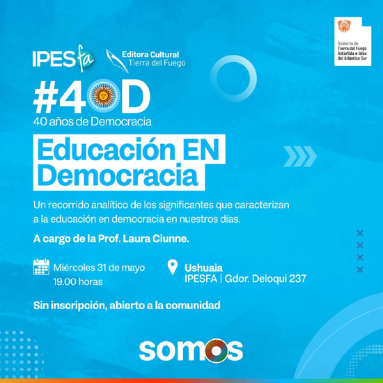 USHUAIA.- La Secretaría de Cultura de Tierra del Fuego, AIAS a través de la Editora Cultura de la Provincia en el marco de las actividades por los 40 años de democracia ininterrumpida llevará a cabo la charla debate “Educación EN Democracia” a cargo de Laura Ciunne el miércoles 31 de mayo a las 19hs en el IPES Florentino Ameghino (Gdor. Deloqui 237).