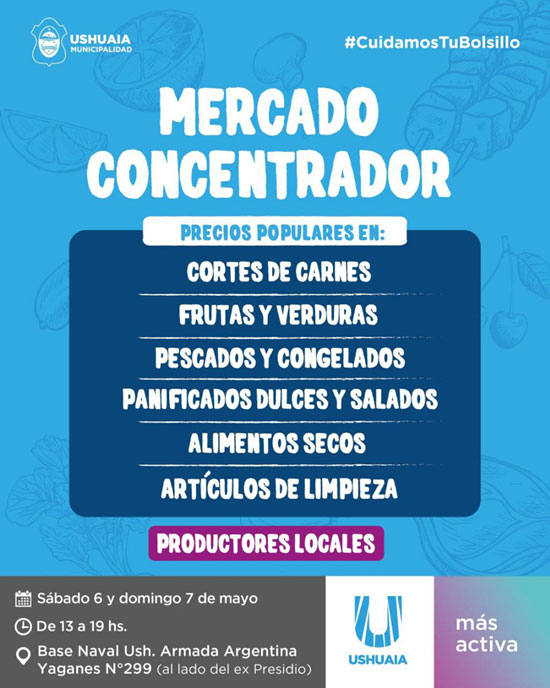 USHUAIA.- La Municipalidad de Ushuaia invita a los vecinos y vecinas a participar de una nueva edición del Mercado Concentrador, que se llevará a cabo el sábado 6 y domingo 7 de mayo en la Base Naval Ushuaia, Armada Argentina, sito en calle Yaganes 299 -al lado del ex Presidio-, en el horario de 13 a 19 horas.