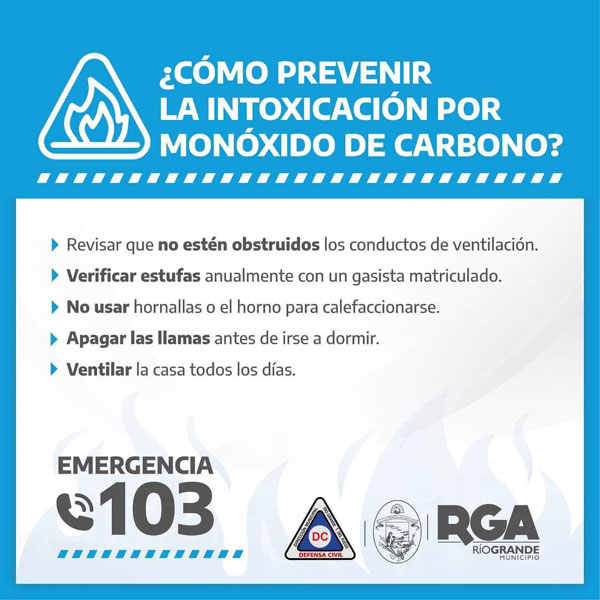 RIO GRANDE.-  Con el fin de evitar y prevenir la intoxicación con monóxido de carbono, desde la Dirección de Defensa Civil Municipal se brindó una serie de recomendaciones para los vecinos y vecinas de la ciudad, frente a las bajas temperaturas y la necesidad de calefaccionarse.