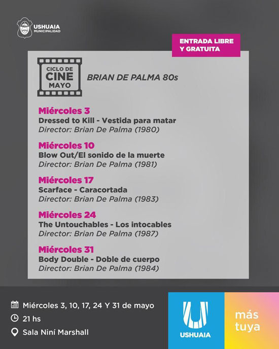 USHUAIA.- La Municipalidad de de Ushuaia, a través de la Secretaría de Cultura y Educación y la Coordinación de Juventudes, llevarán adelante durante mayo una nueva edición del ciclo de “Cine Nerd”, siendo el título “Brian de Palma 80’s”, en honor al icónico director de películas como “Scarface” o “Los intocables”.