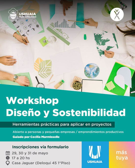 USHUAIA.- La Municipalidad de Ushuaia, a través de la Secretaría de Cultura y Educación, impulsará un Workshop de “Diseño y Sostenibilidad” apuntado a personas y pequeñas empresas los días 29, 30 y 31 de mayo entre las 17:00 y 20:00 horas en Casa Jaguar, ubicada en Deloqui 45 1° Piso.
