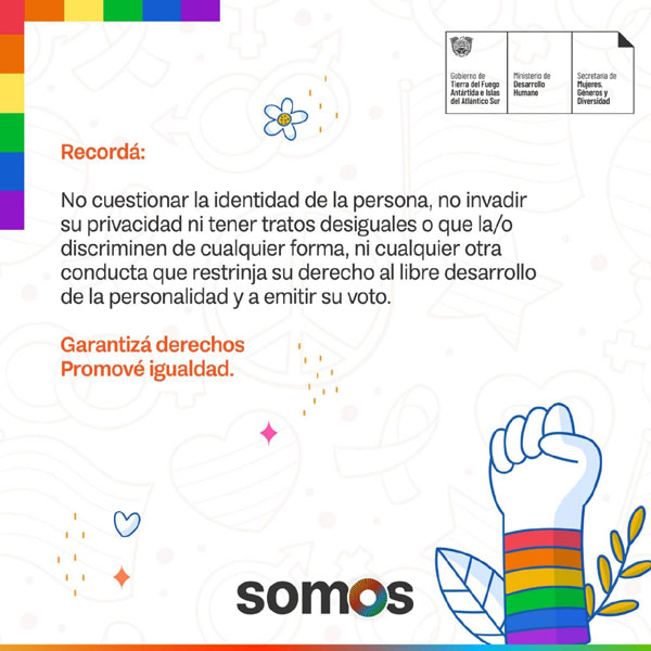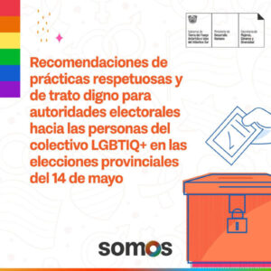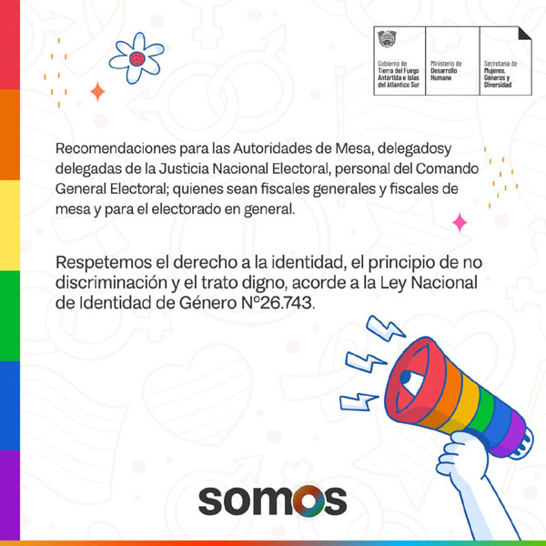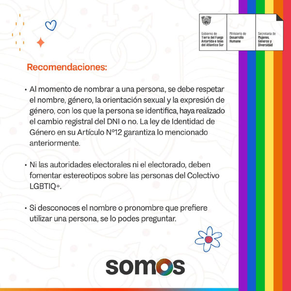 PROVINCIAL.- El Ministerio de Desarrollo Humano, a través de la Subsecretaría de Diversidad, difundió una serie de recomendaciones de prácticas respetuosas y trato digno hacia las personas del colectivo LGBTIQ+, dirigido a autoridades electorales que se desempeñarán en las próximas elecciones provinciales el 14 de mayo.