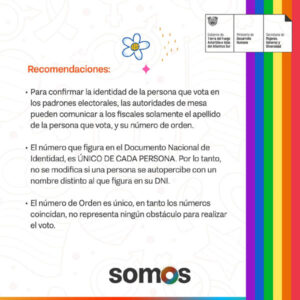 En esta línea, el área de Diversidad provincial, recuerda que al momento de confirmar la identidad de la persona que vota en los padrones electorales, las autoridades de mesa deben comunicar a los fiscales solo el apellido y el número de orden de esa persona.