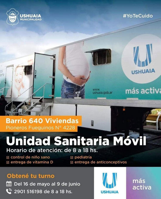 USHUAIA.- La Municipalidad de Ushuaia recuerda a la comunidad que la Unidad Sanitaria Móvil seguirá brindando atención en el barrio 640 Viviendas hasta el 9 de junio. Esta unidad está ubicada en la calle Pioneros Fueguinos 4228 y su horario de atención es de 8 a 18 horas. En ella, los profesionales de la salud del Municipio ofrecen una amplia gama de servicios, que incluyen controles de niño sano, atención pediátrica, enfermería, así como la entrega de anticonceptivos y vitamina D.
