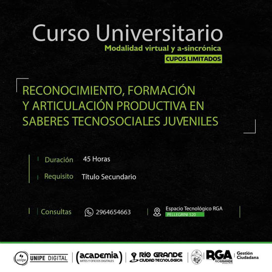 RIO GRANDE.- Están abiertas las inscripciones para el curso universitario «Reconocimiento, formación y articulación productiva en saberes tecnosociales juveniles”. El mismo forma parte de una Diplomatura de tres tramos de formación.