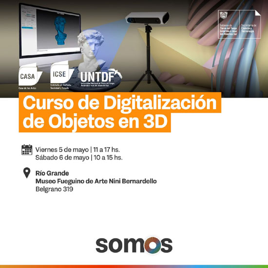 RIO GRANDE.-  Desde la Secretaría de Ciencia y Tecnología dependiente del Ministerio de Educación, Cultura, Ciencia y Tecnología, conjuntamente con Casa de las Artes de la Universidad Nacional de Tierra del Fuego, se brindará un curso intensivo en digitalización de objetos en 3D los días 5 y 6 de Mayo en las instalaciones del Museo Fueguino de Arte “Nini Bernadello” en la ciudad de Río Grande.