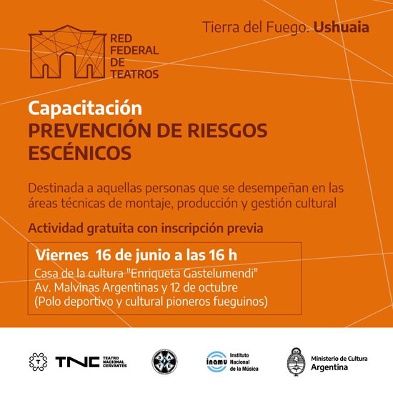 USHUAIA.- La Municipalidad de Ushuaia, a través de la Secretaría de Cultura y Educación, invita a la capacitación “Prevención de Riesgos Escénicos” que llevará adelante el Ministerio de Cultura de la Nación en la Sala Niní Marshall el día viernes 16 de junio a las 16:00 horas. Quienes deseen inscribirse podrán hacerlo a través del siguiente formulario: https://acortar.link/Ud6SoP