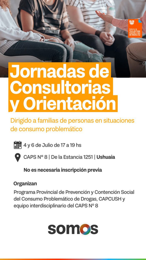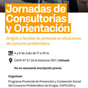 El funcionario agregó que durante el 4 y el 6 de julio, en el horario de 17 a 19, habrá “consultorías y asesorías por parte de agentes de CAPC-USH”, quienes ofrecerán “orientación y apoyo a las personas o familias que estén en situación de consumo problemático o riesgo”.