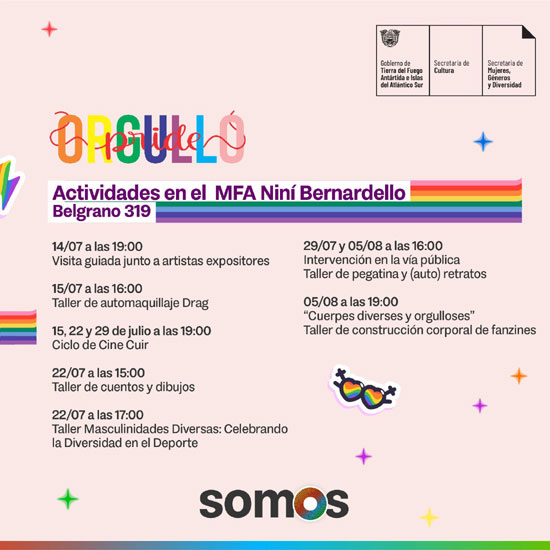 RIO GRANDE.-   En conjunto con la Secretaría de Mujeres, Géneros y Diversidades de la provincia, la Dirección de Desarrollo Audiovisual y la Escuela Popular de Géneros, Disidencias, Masculinidades y Cambio Social, la Secretaría de Cultura a organizado distintas actividades en el marco de la muestra Orgullo, expuesta en el Museo Fueguino de Arte ‘Niní Bernardello’ (Belgrano 319).