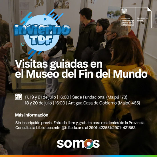 USHUAIA.-    La Secretaría de Cultura de la provincia, a través de la Dirección de Museos y Patrimonio Cultural llevará adelante visitas guiadas destinadas un público adulto, en el marco del Invierno TDF en las sedes del Museo del Fin del Mundo a las 16:00 los lunes, miércoles y viernes en Av. Maipú 173 y martes y jueves en Av. Maipú 465.