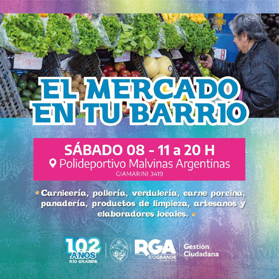 RIO GRANDE.- El Municipio de Río Grande recuerda que hoy se realizará “El Mercado en tu Barrio” en el Gimnasio Malvinas Argentinas (Giamarini 3419). Las puertas estarán abiertas desde las 11 hasta las 20 horas.
