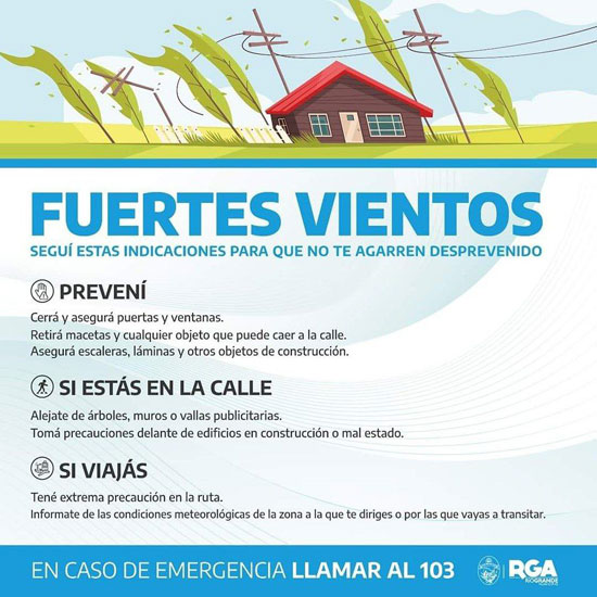 RIO GRANDE.- El Municipio informa a través de Defensa Civil, que rige para la madrugada del viernes 4 de agosto una alerta amarilla en la ciudad, a raíz de las fuertes ráfagas de viento que superarán los 80 km/H, disminuyendo hacia el mediodía.