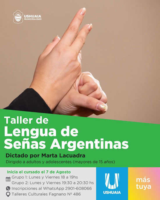 USHUAIA.- La Secretaría de Cultura y Educación de la Municipalidad de Ushuaia informa que se encuentran abiertas las inscripciones a un nuevo taller de Lengua de Señas Argentinas, el que será dictado por la facilitadora Marta Lacuadra.
